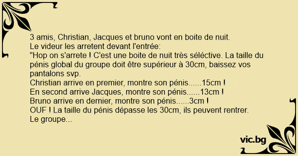 "Hop on s'arrete ! C'est une boite de nuit très séléctive. La taille du pénis global du groupe doit être supérieur à 30cm, baissez vos pantalons svp.