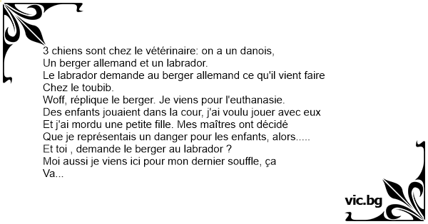 Woff, réplique le berger. Je viens pour l'euthanasie.