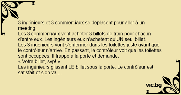 Pour le retour, les 3 commerciaux decident de faire de meme et n' achètent qu'UN seul billet. Quant aux ingénieurs, ils n’achètent AUCUN billet. Les 3 commerciaux vont s’enfermer dans les toilettes juste avant que le contrôleur n’arrive. Les ingénieurs passent discrètement à côté, frappent à la porte et demandent