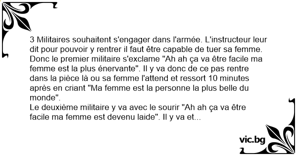 Donc le premier militaire s'exclame "Ah ah ça va être facile ma femme est la plus énervante". Il y va donc de ce pas rentre dans la pièce là ou sa femme l'attend et ressort 10 minutes après en criant "Ma femme est la personne la plus belle du monde".