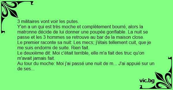 C'est 3 gars saouls dans un bar, à la fermeture du bar, ils cherchaient une place où terminer la soirée. Ils vont donc dans un bordel. La dame leur dit : - Il me reste seulement 2 filles donc les 2...