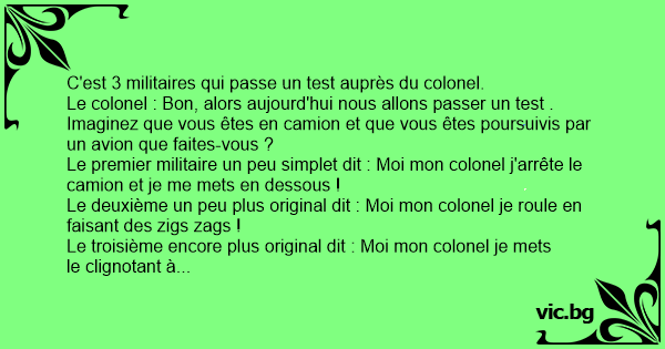 Le premier militaire un peu simplet dit : Moi mon colonel j'arrête le camion et je me mets en dessous !