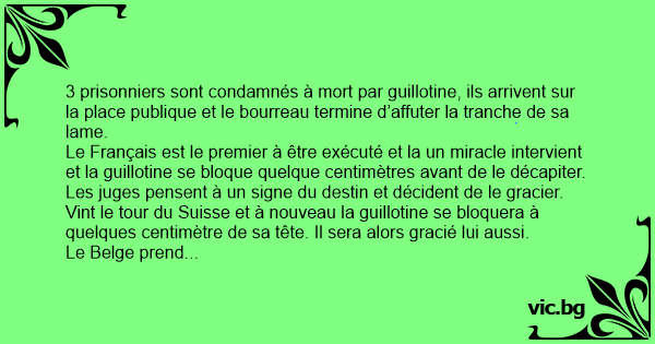 3 prisonniers sont condamnés à mort par guillotine, ils arrivent sur la place publique et le bourreau termine d’affuter la tranche de sa lame.