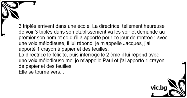 3 triplés arrivent dans une école. La directrice, tellement heureuse de voir 3 triplés dans son établissement va les voir et demande au premier son nom et ce qu'il a apporté pour ce jour de rentrée : avec une voix mélodieuse, il lui répond je m'appelle Jacques, j'ai apporté 1 crayon à papier et des feuilles.