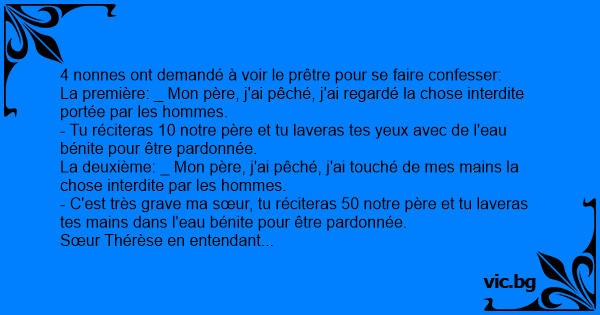 - C'est très grave ma sœur, tu réciteras 50 notre père et tu laveras tes mains dans l'eau bénite pour être pardonnée.
