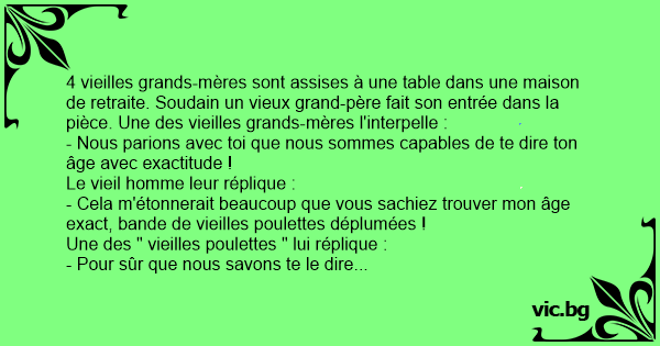 4 vieilles grands-mères sont assises à une table dans une maison de retraite. Soudain un vieux grand-père fait son entrée dans la pièce. Une des vieilles grands-mères l'interpelle :