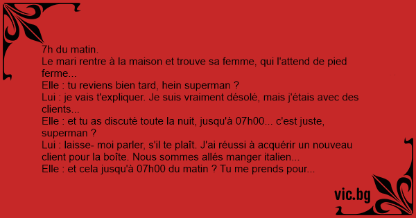 Elle : et cela jusqu'à 07h00 du matin ? Tu me prends pour une demeurée, superman ?