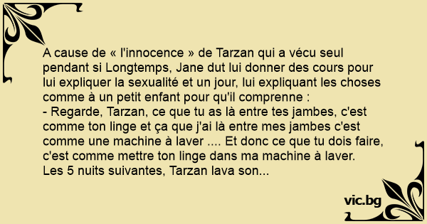 - Regarde, Tarzan, ce que tu as là entre tes jambes, c'est comme ton linge et ça que j'ai là entre mes jambes c'est comme une machine à laver .... Et donc ce que tu dois faire, c'est comme mettre ton linge dans ma machine à laver.