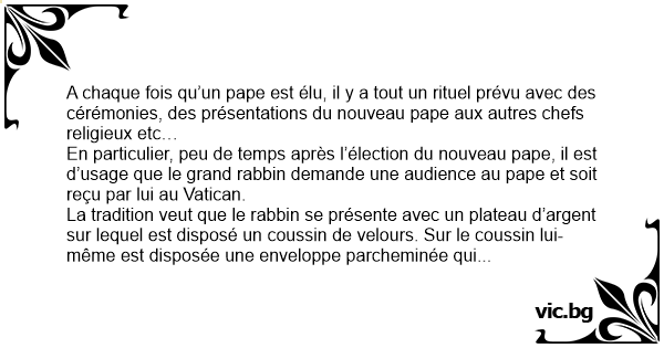 - Mon frère, je dois vous confesser que ce rituel que nous venons d’accomplir, et qui semble s’être déroulé depuis des siècles entre papes et grands rabbins, a une signification qui m’échappe totalement. Je comptais sur vous pour m’expliquer quelle était la signification de tout ceci.