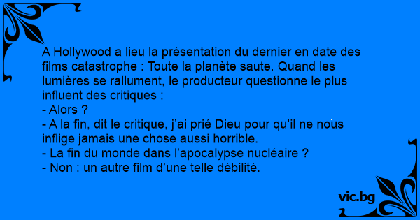 A Hollywood a lieu la présentation du dernier en date des films catastrophe : Toute la planète saute. Quand les lumières se rallument, le producteur questionne le plus influent des critiques :