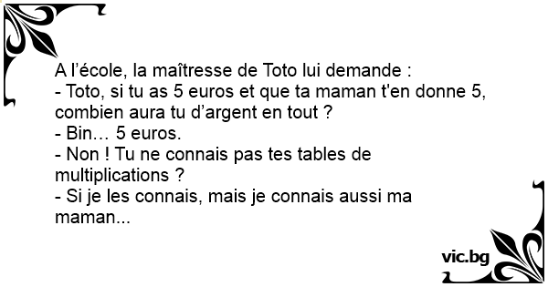 - Toto, si tu as 5 euros et que ta maman t'en donne 5, combien aura tu d’argent en tout ?