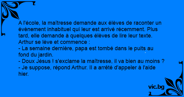 A l'école, la maîtresse demande aux élèves de raconter un évènement inhabituel qui leur est arrivé récemment. Plus таrd, elle demande à quelques élèves de lire leur texte. Arthur se lève et commence :