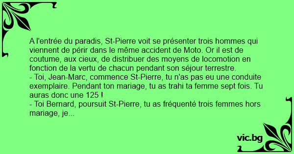 A l'entrée du paradis, St-Pierre voit se présenter trois hommes qui viennent de périr dans le même accident de Moto. Or il est de coutume, aux cieux, de distribuer des moyens de locomotion en fonction de la vertu de chacun pendant son séjour terrestre.