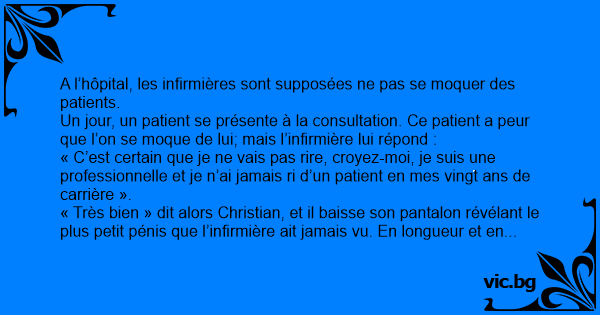 « Très bien » dit alors Christian, et il baisse son pantalon révélant le plus petit pénis que l’infirmière ait jamais vu. En longueur et en diamètre, ce n’était pas plus gros qu’une pile AAA.