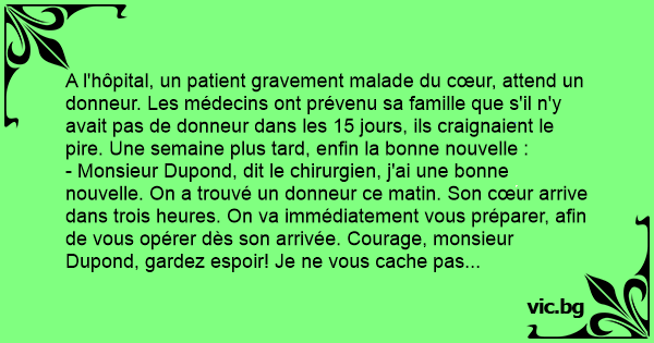 - Monsieur Dupond, dit le chirurgien, j'ai une воnnе nouvelle. On a trouvé un donneur ce matin. Son cœur arrive dans trois heures. On va immédiatement vous préparer, afin de vous opérer dès son arrivée. Courage, monsieur Dupond, gardez espoir! Je ne vous cache pas que j'estime à 25 % les chances de réussite de la transplantation, mais motivez-vous et gardez le moral. Je vous assure que toute l'équipe médicale est dans cet état d'еsрriт et fera tout pour vous sauver!