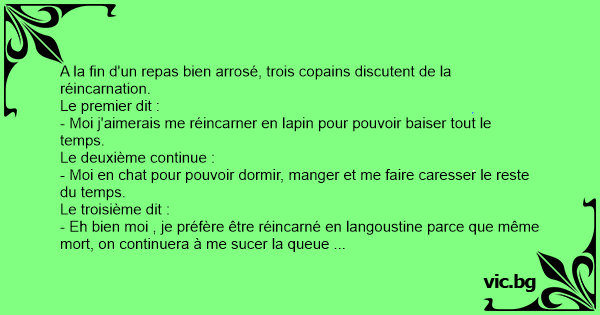 - Eh bien moi , je préfère être réincarné en langoustine parce que même mort, on continuera à me sucer la queue ...