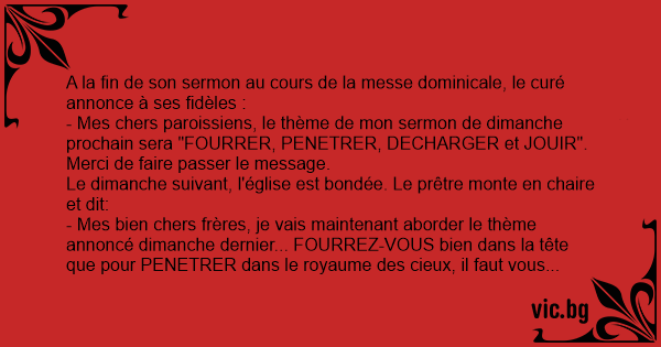- Mes bien chers frères, je vais maintenant aborder le thème annoncé dimanche dernier... FOURREZ-VOUS bien dans la tête que pour PENETRER dans le royaume des cieux, il faut vous DECHARGER de vos péchés, afin de JOUIR du paradis éternel ! Amen. Pour avoir eu de mauvaises pensées, vous direz 3 pater et 3 avé!