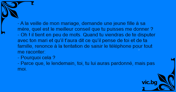- A la veille de mon mariage, demande une jeune fille à sa mère, quel est le meilleur conseil que tu puisses me donner ?