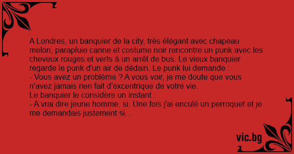 Un vieil homme est dans un restaurant. Sur la table d'à côté, il apercoit un punk avec une crète rouge. Il le regarde alors pendant un bon moment. Le punk, agacé par cela, se lève alors et se...