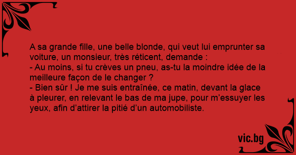 A sa grande fille, une belle blonde, qui veut lui emprunter sa voiture, un monsieur, très réticent, demande :