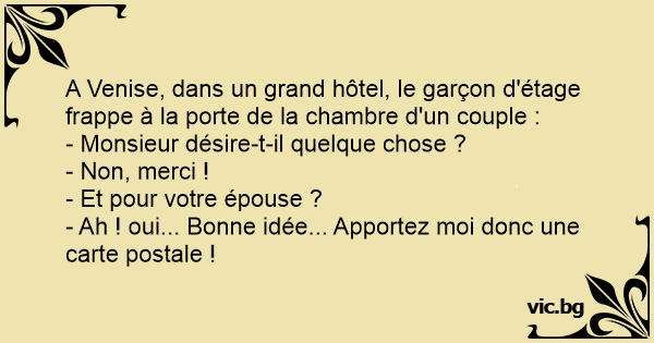 - Мога ли да ви услужа с още нещо? - пита пиколо, което току що е настанило в хотелската стая мъж и жена. Le jour de la Saint Valentin, le garçon d'étage d'un grand hôtel parisien frappe à la porte d'une chambre et demande au couple : O camareiro de um hotel cinco estrelas, no Rio, pergunta ao homem que acabou de se hospedar com uma linda mulher de 24 anos: — O senhor deseja alguma coisa? — Não obrigado! — Diz o homem... A Venezia, al Grand Hotel, il cameriere bussa alla porta di una coppia: – “Il signore ha bisogno di qualche cosa?” – “No, grazie” – “E per sua moglie” – “Ah, si, buona idea… mi porti una cartolina... Un couple arrive dans un hôtel chic à Saint Tropez. Le groom monte les bagages, installe les personnes,  puis il demande au monsieur : - Avez-vous besoin de quelque chose, monsieur ? - Non merci. -... Do horského hotelu přijede pán s mladou ženou. Poslíček je uvede do pokoje a ptá se: „Mohu pro vás ještě něco udělat?” „To je všechno,” odpoví muž. „A pro vaši ženu?” „Jo, málem bych zapomněl,...