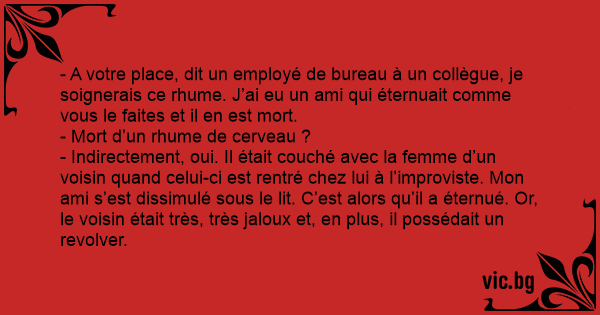 - A votre place, dit un employé de bureau à un collègue, je soignerais ce rhume. J’ai eu un ami qui éternuait comme vous le faites et il en est mort.
