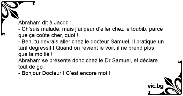 - Ben, tu devrais aller chez le docteur Samuel. Il pratique un tarif dégressif ! Quand on revient le voir, il ne prend plus que la moitié !