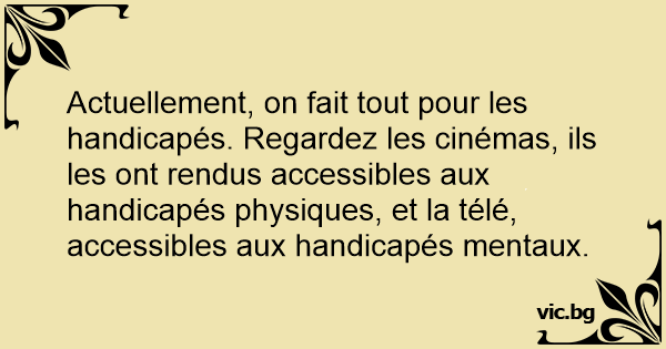 Actuellement, on fait tout pour les handicapés. Regardez les cinémas, ils les ont rendus accessibles aux handicapés physiques, et la télé, accessibles aux handicapés mentaux.