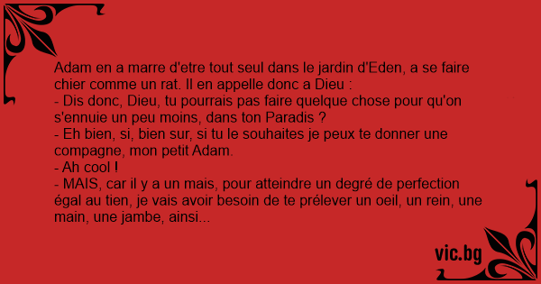 Adam en a marre d'etre tout seul dans le jardin d'Eden, a se faire chier comme un rat. Il en appelle donc a Dieu :