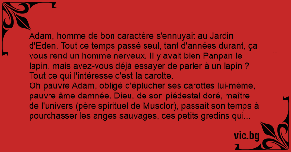 Adam, homme de bon caractère s'ennuyait au Jardin d'Eden. Tout ce temps passé seul, tant d'années durant, ça vous rend un homme nerveux. Il y avait bien Panpan le lapin, mais avez-vous déjà essayer de parler à un lapin ? Tout ce qui l'intéresse c'est la carotte. Oh pauvre Adam, obligé d'éplucher ses carottes lui-même, pauvre âme damnée. Dieu, de son piédestal doré, maître de l'univers (père spirituel de Musclor), passait son temps à pourchasser les anges sauvages, ces petits gredins qui pullulaient comme des mouches au Paradis, se souciant peu des états d'âme de l'homme. Un jour croisant Adam, il s'arrêta cinq minutes… Dieu : - Salut comment vas-tu Brosse (Adam) Aucune réaction d'Adam, qui n'avait pas le cœur à rire. Dieu insiste : - Quoi, elle est pas drôle ? Et celle là : - « Adam de devant »… Non ? Franchement Adam, tu m'inquiètes, t'es sur que ça va ? - Oui, oui… enfin… - Enfin quoi ? T'es pas heureux ici, avec nous. Et si tu t'ennuies t'as qu'à te faire un ange. - Oh, vous savez les anges, ils ont même pas de sexe… - Oh ! voyons, Adam !… Remarque c'est pas соn… Tu veux dire que c'est rapport au… tu sais, le truc là, que je t'ai mis entre les pattes. - J'osais pas le dire mais j'avoue que des fois ça me démange. - Ça c'est pas grave, c'est les morpions… - Non, je veux dire, À QUOI ÇA SERT ? Dieu perplexe s'en retourna dans sa hutte sans donner réponse à sa dernière création. Les jours passèrent et Dieu n'était toujours pas reparu, quand soudain en entendit résonner dans tout l'Eden un : - « Ça y est ! J'ai encore réussi ! ». Content de lui, Dieu s'en alla voir Adam : - Adam, mon fils ! viens ici, faut que je te présente quelqu'un. Voilà, c'est Josette, Oh elle n'est pas parfaite mais c'est bien ce que tu voulais. - Hmmm…, oui, elle est en quoi ?! C'est du latex, tu peux toucher, on dirai presque de la peau… J'ai même pensé à mettre des poils aux endroits stratégiques, ça te rappellera Panpan. Et en plus ça pèse presque rien, et puis quand tu ne t'en sers plus tu la dégonfles, ça prend moins de place. Adam n'était qu'a moitié content de sa nouvelle acquisition, il manquait quelque chose, une âme peut-être. Quoiqu'il en soit au bout d'une semaine il revit Dieu et lui dit : - Non, ça marche pas votre truc, j'ai déjà crevé trois fois, et hier elle a éclaté ça m'en a foutu partout, qui c'est qui va nettoyer tout ça maintenant ?!? Et dieu créa la femme…