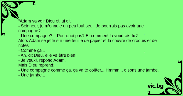 C'est Adam dans le Jardin d'éden. Dieu, qui l'observe depuis un bon moment remarque que son petit protégé s'ennuie. Dieu: "Adam, Qu'est-ce qui ne va pas mon enfant?" Adam répond: "Oh rien mon...