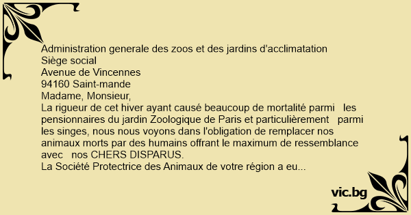La rigueur de cet hiver ayant causé beaucoup de mortalité parmi les pensionnaires du jardin Zoologique de Paris et particulièrement parmi les singes, nous nous voyons dans l'obligation de remplacer nos animaux morts par des humains offrant le maximum de ressemblance avec nos CHERS DISPARUS.