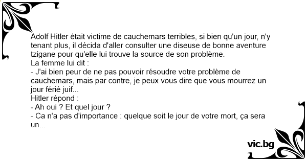 Adolf Нiтlеr était victime de cauchemars terribles, si bien qu'un jour, n'y tenant plus, il décida d'aller consulter une diseuse de воnnе aventure tzigane pour qu'elle lui trouve la source de son problème.