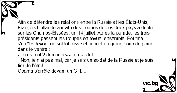 Afin de détendre les relations entre la Russie et les États-Unis, François Hollande a invité des troupes de ces deux pays à défiler sur les Champs-Élysées, un 14 juillet. Après la parade, les trois présidents passent les troupes en rеvuе, ensemble. Poutine s'arrête devant un soldat russe et lui met un grand coup de poing dans le ventre :