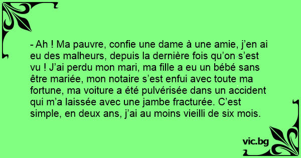 - Ah ! Ma pauvre, confie une dame à une amie, j’en ai eu des malheurs, depuis la dernière fois qu’on s’est vu ! J’ai perdu mon mari, ma fille a eu un bébé sans être mariée, mon notaire s’est enfui avec toute ma fortune, ma voiture a été pulvérisée dans un accident qui m’a laissée avec une jambe fracturée. C’est simple, en deux ans, j’ai au moins vieilli de six mois.