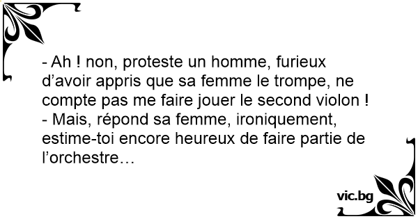 - Ah ! non, proteste un homme, furieux d’avoir appris que sa femme le trompe, ne compte pas me faire jouer le second violon !