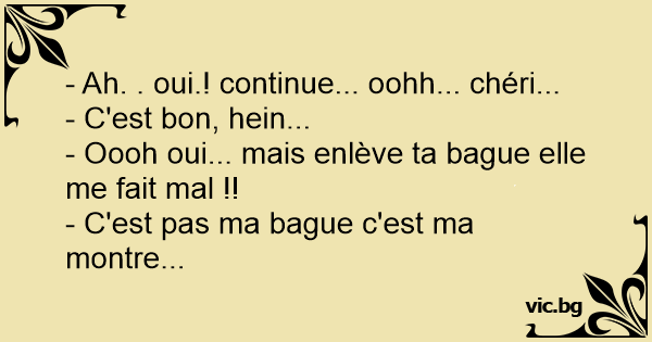 Un couple est en train de faire l'amour. La femme dit : - Chéri, ton alliance me fait mal. - Ce n'est pas mon alliance, mais ma montre.