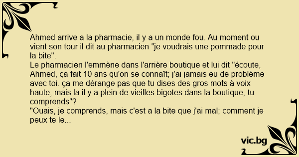 Ahmed arrive a la pharmacie, il y a un monde fou. Au moment ou vient son tour il dit au pharmacien "je voudrais une pommade pour la bite".