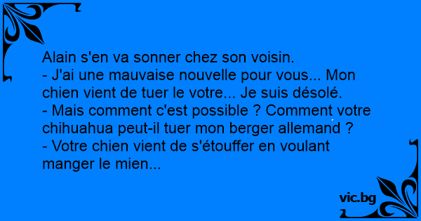 - J'ai une mauvaise nouvelle pour vous... Mon chien vient de tuer le votre... Je suis désolé.