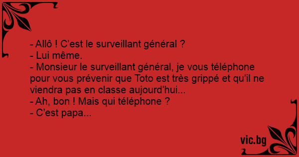 - Monsieur le surveillant général, je vous téléphone pour vous prévenir que Toto est très grippé et qu'il ne viendra pas en classe aujourd'hui...