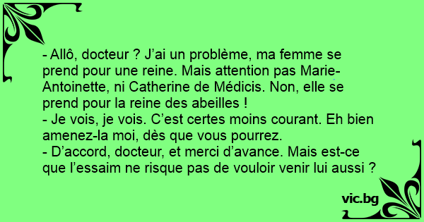 - Allô, docteur ? J’ai un problème, ma femme se prend pour une reine. Mais attention pas Marie-Antoinette, ni Catherine de Médicis. Non, elle se prend pour la reine des abeilles !