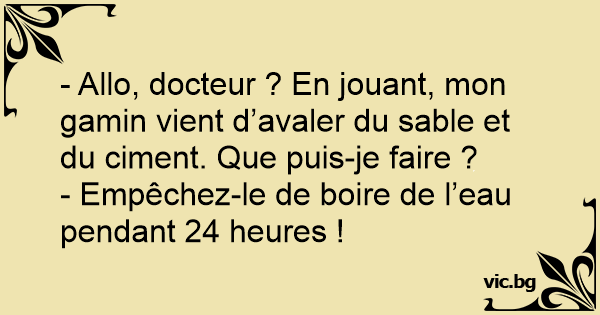 - Allo, docteur ? En jouant, mon gamin vient d’avaler du sable et du ciment. Que puis-je faire ?