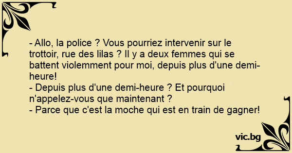- Allô la police! - Oui allô. - 2 filles se battent pour moi. - Et alors? - La moche est entrain de gagnée.
