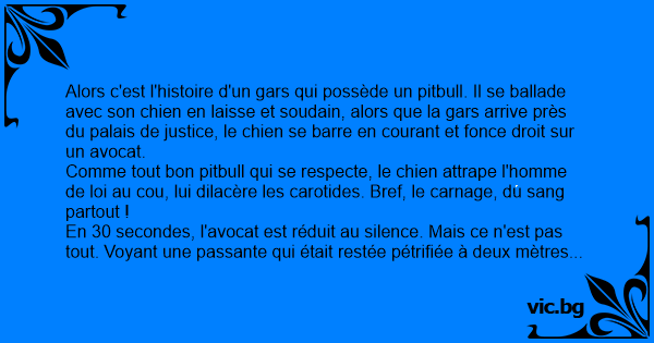 Alors c'est l'histoire d'un gars qui possède un pitbull. Il se ballade avec son chien en laisse et soudain, alors que la gars arrive près du palais de justice, le chien se barre en courant et fonce droit sur un avocat.