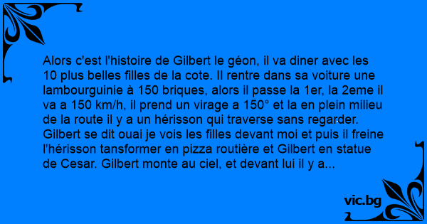 Alors c'est l'histoire de Gilbert le géon, il va diner avec les 10 plus belles filles de la cote. Il rentre dans sa voiture une lambourguinie à 150 briques, alors il passe la 1er, la 2eme il va a 150 km/h, il prend un virage a 150° et la en plein milieu de la route il y a un hérisson qui traverse sans regarder. Gilbert se dit ouai je vois les filles devant moi et puis il freine l'hérisson tansformer en pizza routière et Gilbert en statue de Cesar. Gilbert monte au ciel, et devant lui il y a st Pierre il dort avec l'oréol sur le nez . Gilbert et dans un état épouvantable ."Monsieur st Pierre, monsieur st Pierre".