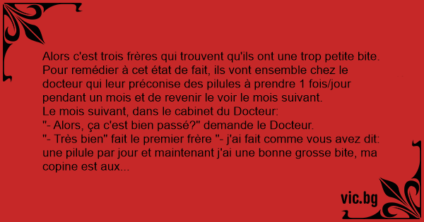 Alors c'est trois frères qui trouvent qu'ils ont une trop petite bite. Pour remédier à cet état de fait, ils vont ensemble chez le docteur qui leur préconise des pilules à prendre 1 fois/jour pendant un mois et de revenir le voir le mois suivant.