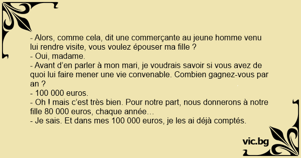 - Alors, comme cela, dit une commerçante au jeune homme venu lui rendre visite, vous voulez épouser ma fille ?