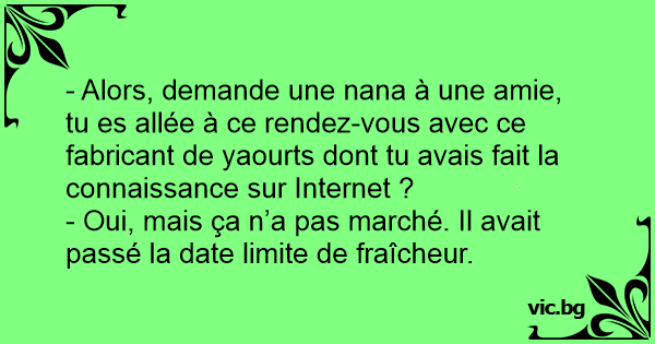 - Alors, demande une nana à une amie, tu es allée à ce rendez-vous avec ce fabricant de yaourts dont tu avais fait la connaissance sur Internet ?