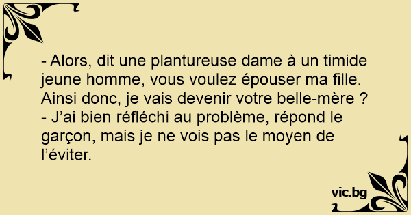 - Alors, dit une plantureuse dame à un timide jeune homme, vous voulez épouser ma fille. Ainsi donc, je vais devenir votre belle-mère ?