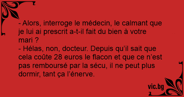 - Hélas, non, docteur. Depuis qu’il sait que cela coûte 28 euros le flacon et que ce n’est pas remboursé par la sécu, il ne peut plus dormir, tant ça l’énerve.